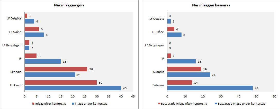 Diagrammen visar dels om inläggen görs på eller efter kontors tid per bolag samt när inläggen besvaras. (Period september 2016)