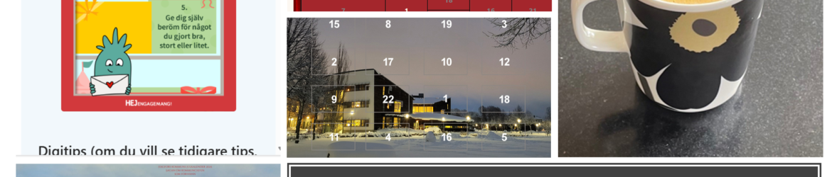 Teamet diskuterade sina arbetsplatsadventskalendrar, med Eva förklarar att i år gör de en aktivitet per vecka i december istället för dagliga uppdateringar på grund av tidsbegränsningar. Pierre föreslog att man skulle lägga till personliga porträtt och göra systemlänkar mer synliga på hemsidan, medan Anna-Carin beskrev skolans adventskalender som använder en bildkarta med klickbara luckor som avslöjar innehåll på motsvarande datum. Cajsa nämnde att de deltar i HejEngagemangs och får dagliga kalenderuppdateringar från dem.