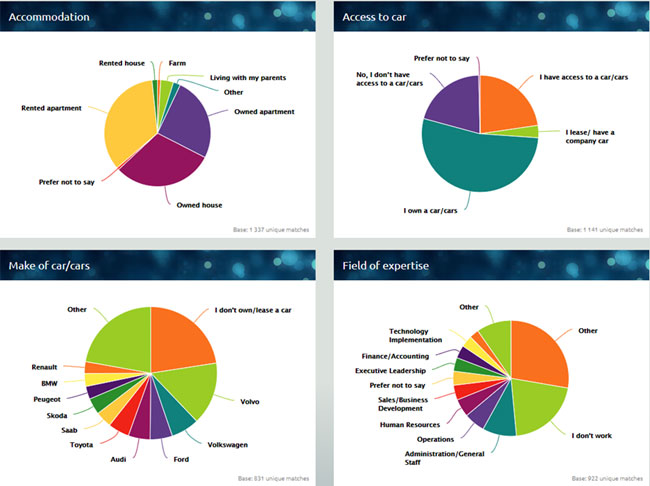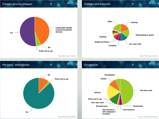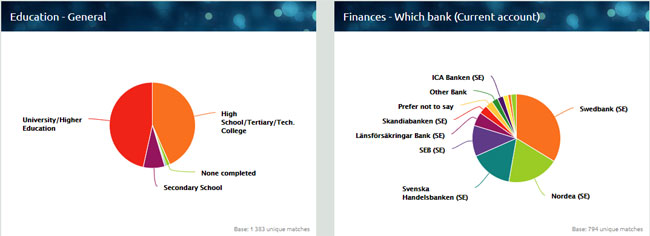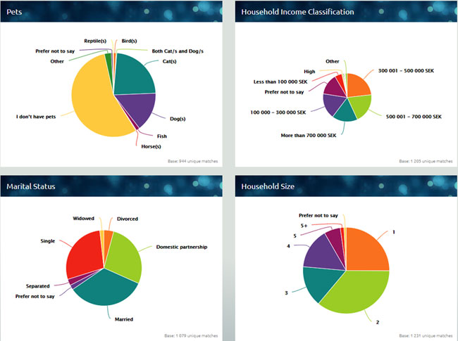 Varje individ har uppgett en rad olika profildata. Allt från hushållets storlek, inkomst till bilmärke, livsmedel och bank. Totalt finns det 22 olika profilområden med upp till 96 olika parametrar.